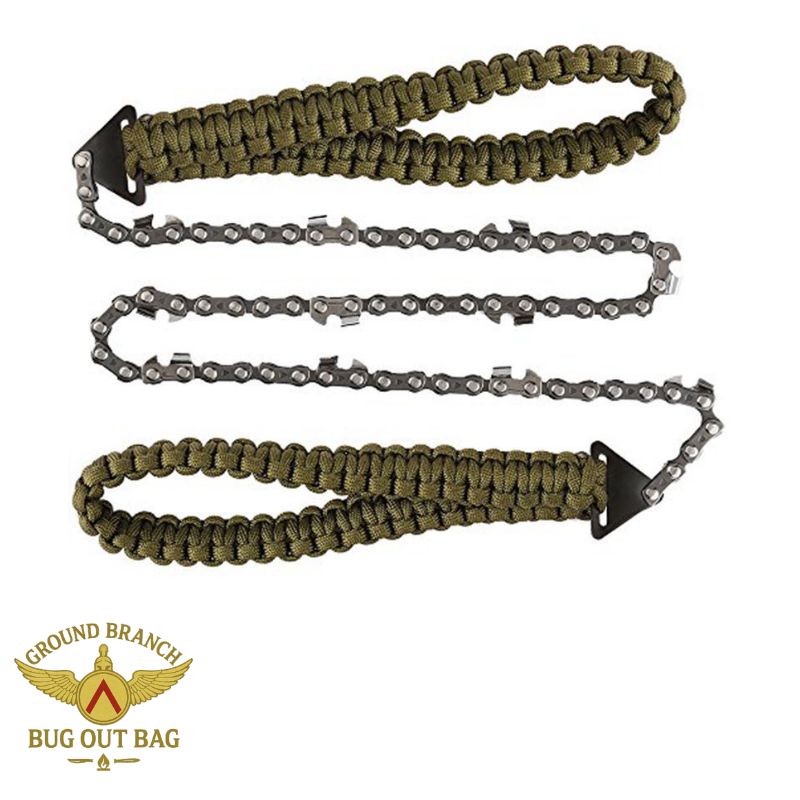 Hand Chain Saw with Paracord Handles – this is a heavy duty metal hand chain saw. None of that wire chain saw stuff. It even has heavy duty OD green paracord handles for comfort and ease of mobility while in use. The chain itself measures 24” in length.