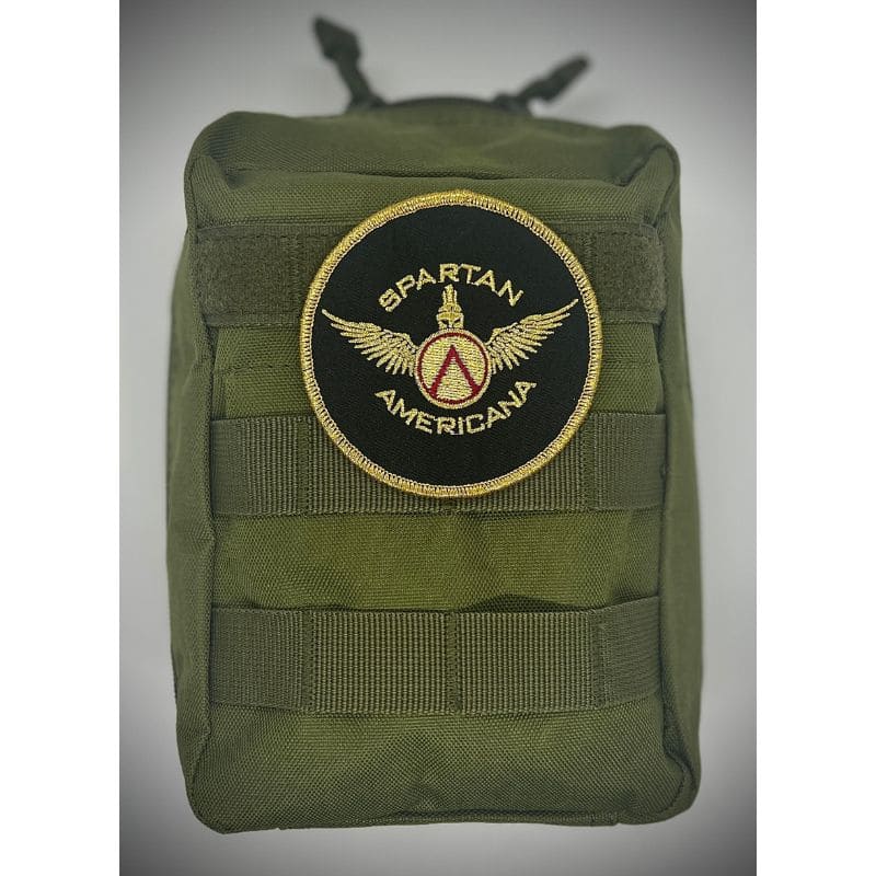 MOLLE Bag – made of olive drab oxford cloth/nylon fabric, this MOLLE-compatible bag measures 8”x6”x5” and has a Velcro strip across the front flaunting the Spartan Americana morale patch – Joe Teti’s tactical training company.