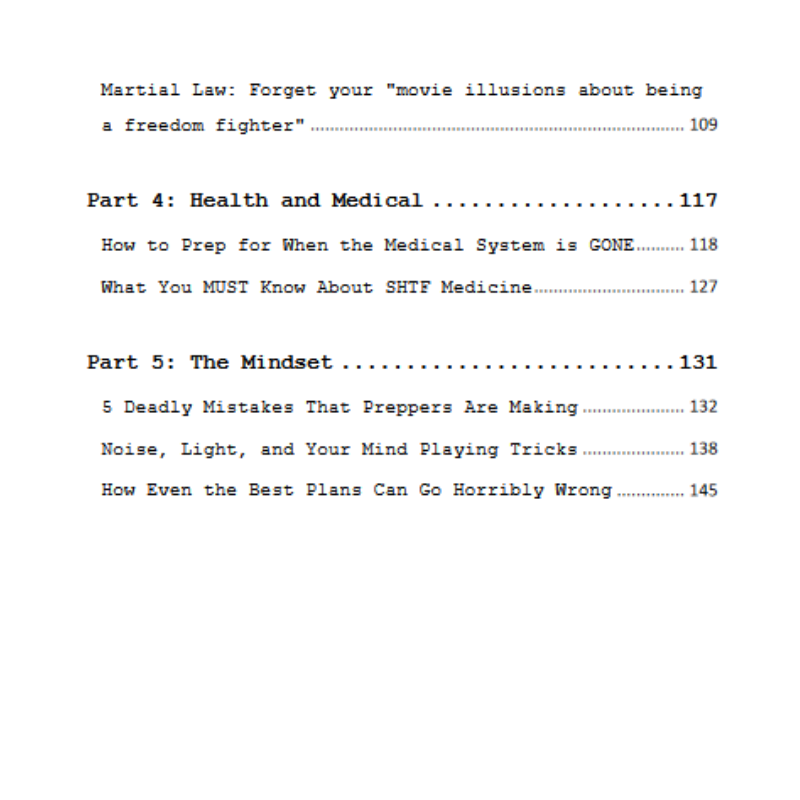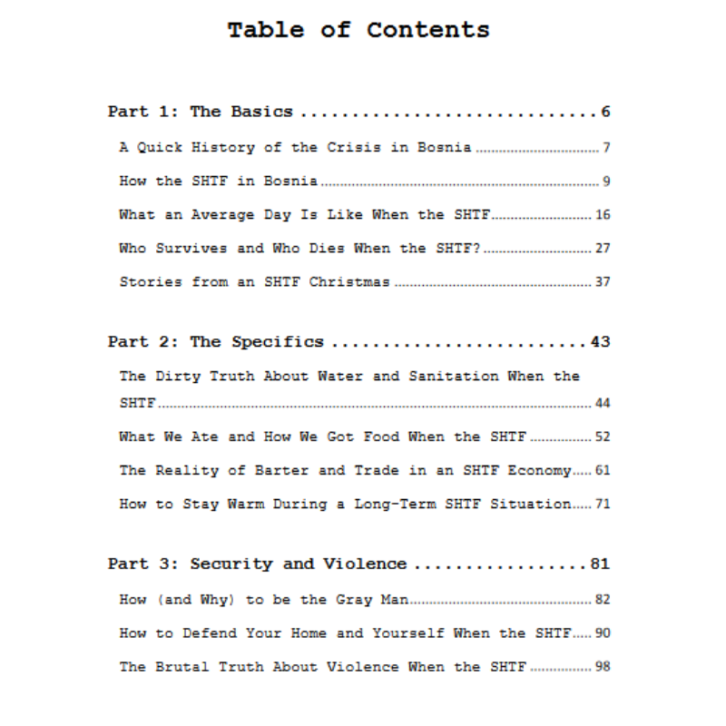 The book covers things like keeping warm, what to eat when there is no grocery store, and the brutal reality of an SHTF event. The lessons learned are hard-won but they can be yours for the asking.