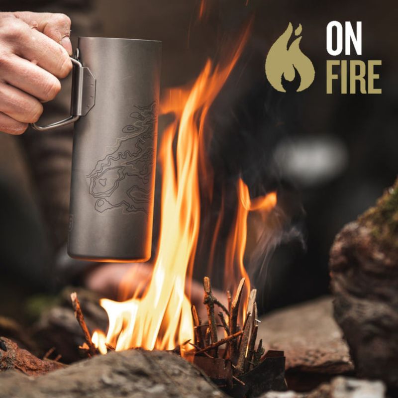 Heat it up! Utilizing the butterfly handles, the Outer Ti Cup can be used to heat water and cook food alongside hot coals or near a direct flame. Can also be used with the Grayl titanium camp stove.